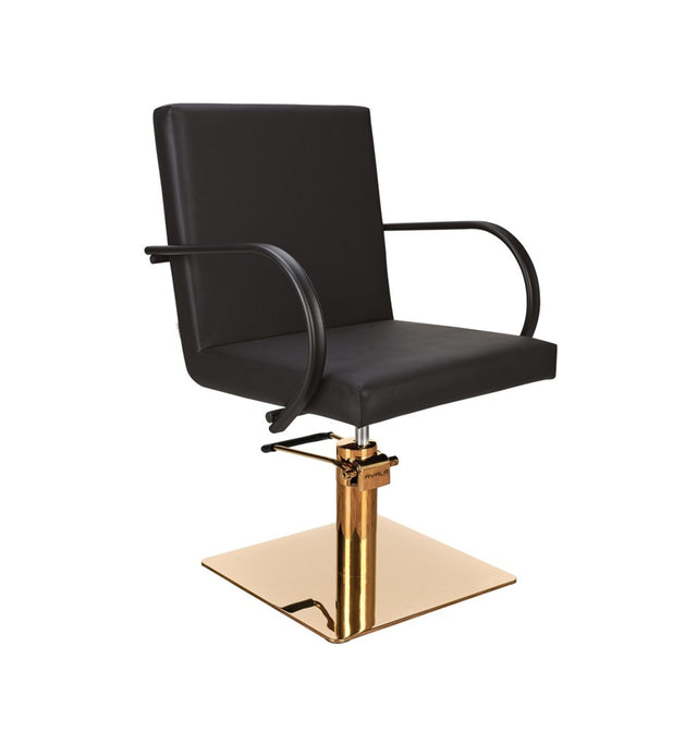 Baza pătrată aurie oferă stabilitate excepțională și transformă scaunul într-un element decorativ central al salonului. Este robustă, elegantă și perfect proporționată pentru a asigura confort și siguranță clienților.