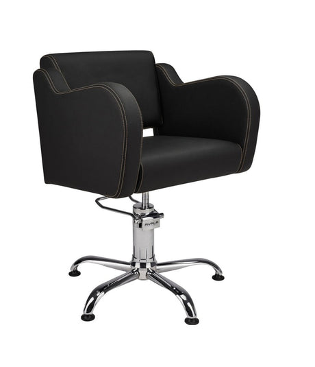 Ayala Holly 01 P-7 Scaun de Coafor Negru cu Cusături Aurii și Bază Rotundă Cromată Argintie